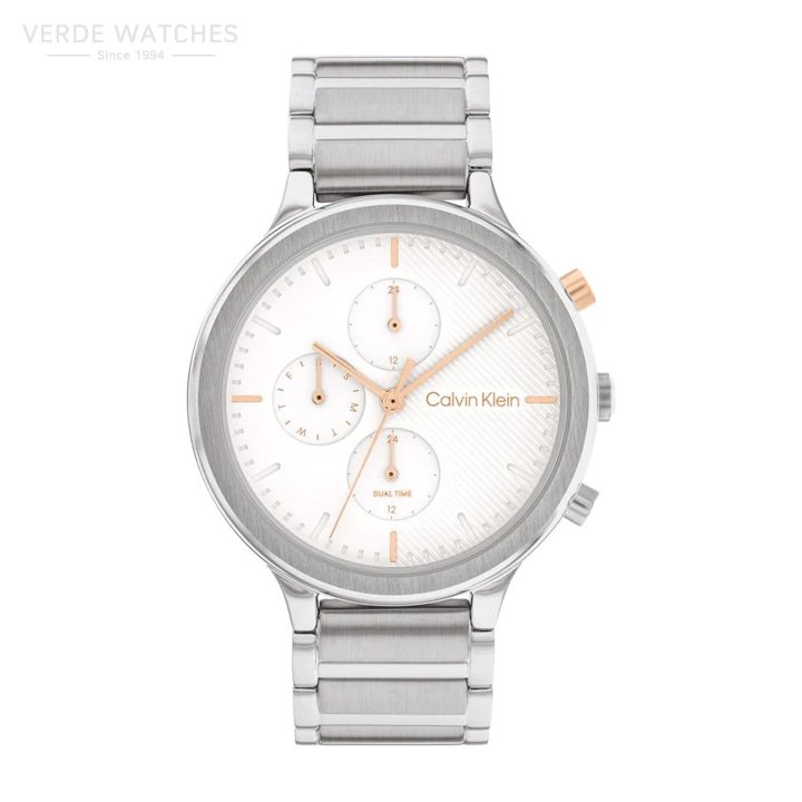 Brand Calvin Klein Gender Female Mechanism Battery powered Crystal Mineral crystal Dial colour White Strap type Stainless Steel Bracelet colour Silver Case size 38mm Water resistant 3 ATM – 30 metres