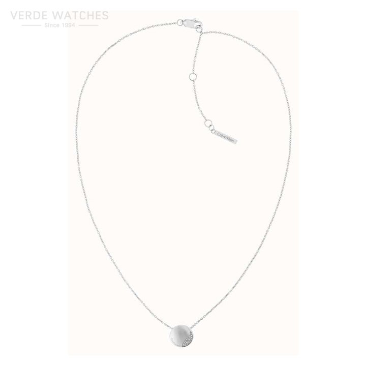 A disc-shaped pendant hangs from the centre of the delicate silver coloured chain.