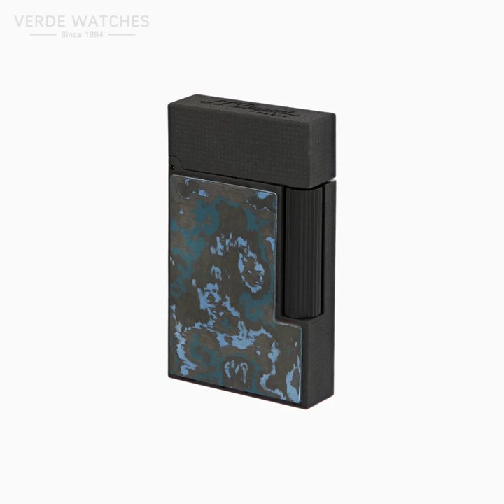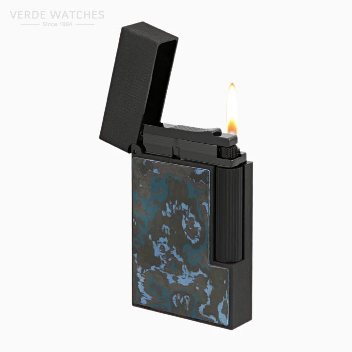 Large classic Ligne 2 lighter with matt black microdiamond head pattern, carbon fibre decoration and signature “cling” sound. Gentle and adjustable double flame.