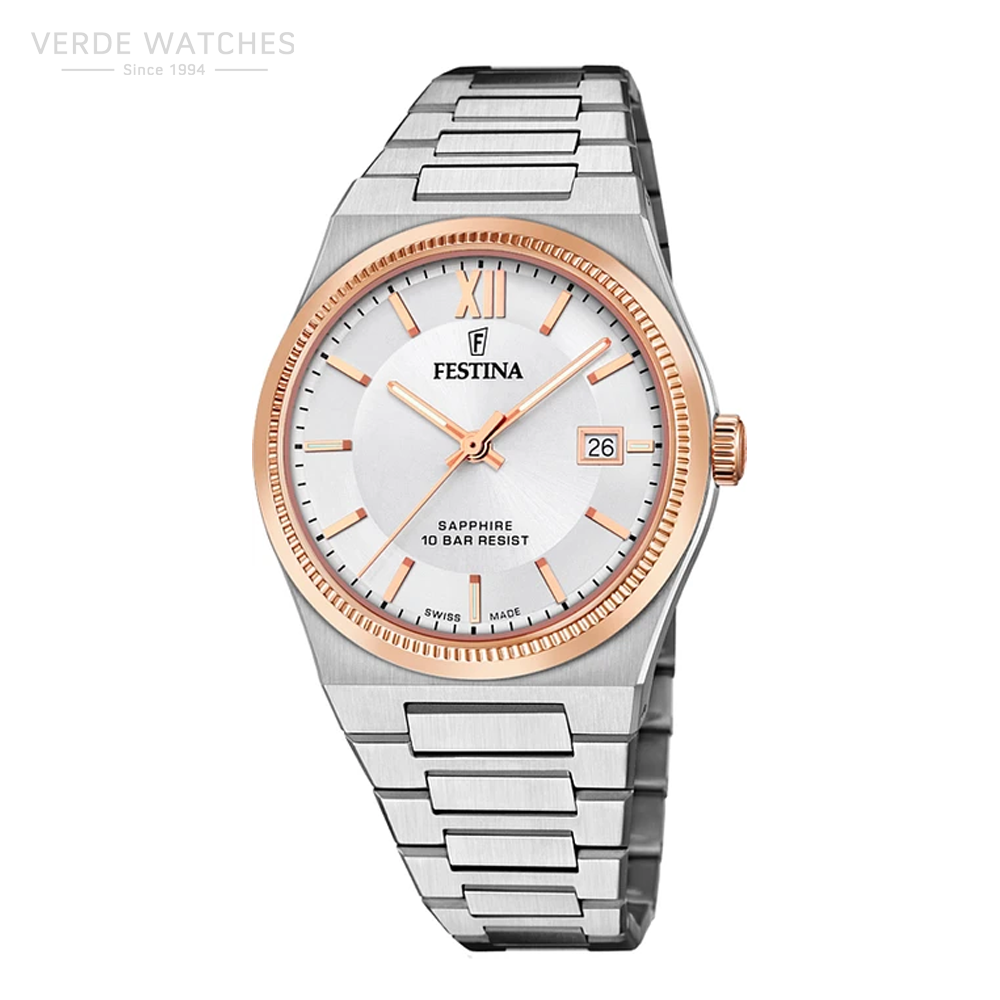 Festina Swiss men’s watch F20036/1 with a stainless steel case and a sapphire glass fitted with a stainless steel bracelet.