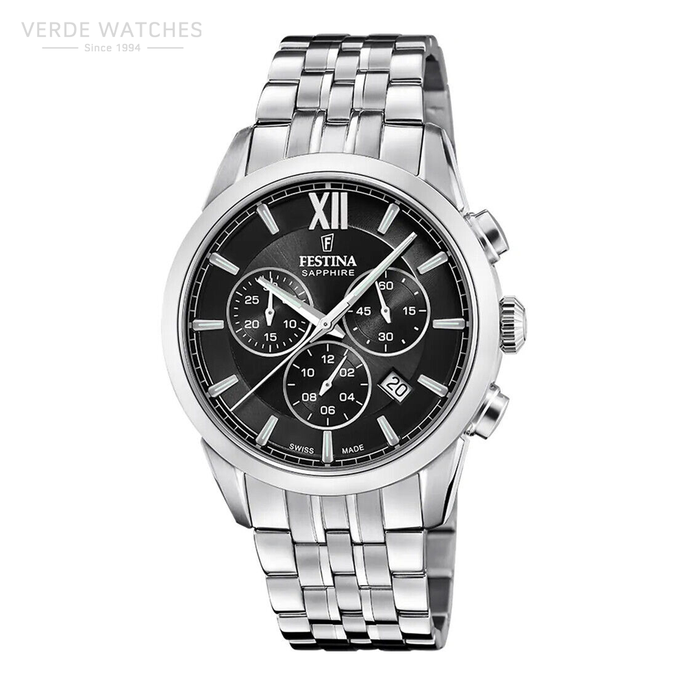 Festina Swiss Made men’s watch F20040/4 with a stainless steel case and a sapphire glass fitted with a stainless steel bracelet.