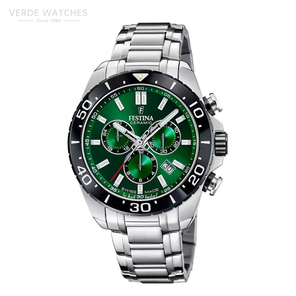 Festina Swiss Made men’s watch F20042/3 with a ceramic case and a sapphire glass fitted with a stainless steel bracelet.