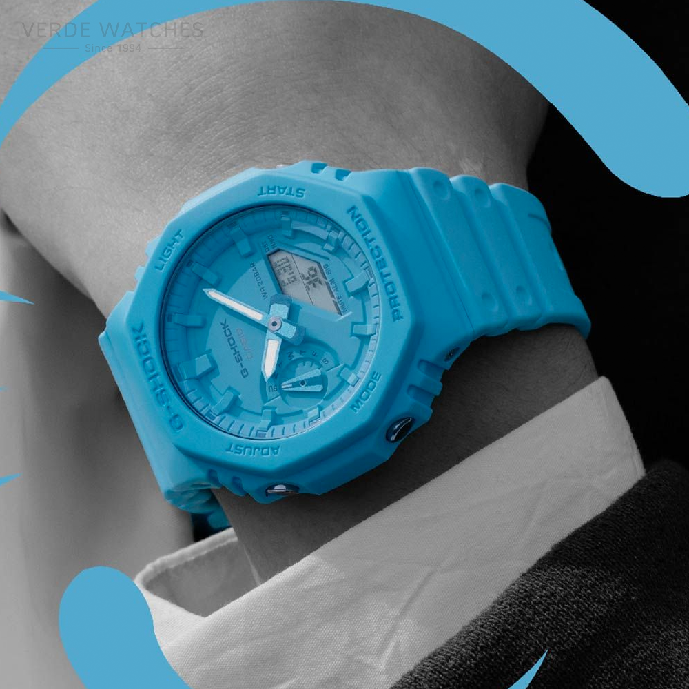 Introducing new vibrant additions to the 2100 line, highlighting its distinctive octagonal bezel. The bezel and band are made with eco-friendly, bio-based resin in bold, turquoise blue and the dial features a monochromatic colour scheme.