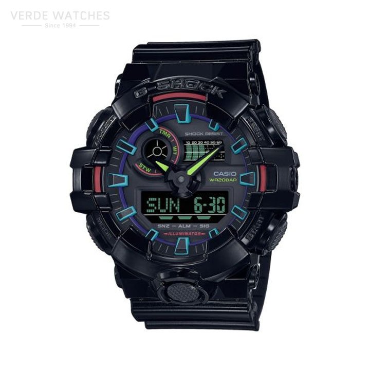 Case size (L× W× H) 57.5 × 53.4 × 18.5 mm Weight 69 g Case and bezel material Case / bezel material: Resin Band Resin Band Construction Shock Resistant Water resistance 200-meter water resistance
