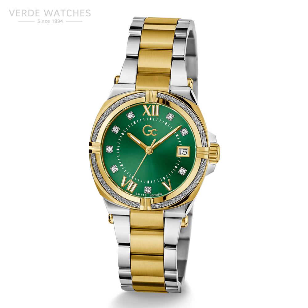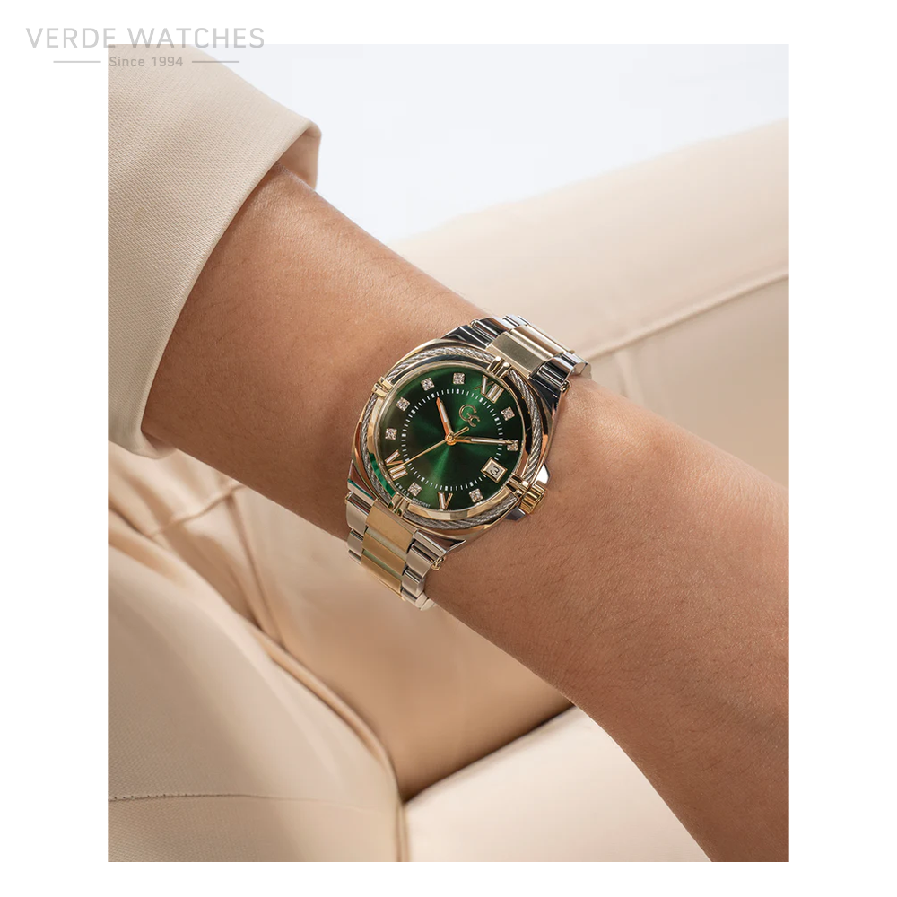 With its unique cable-wire on the top ring – the Gc IronClass and its 32mm cushion case shows a mix of coolness and sophistication. This silver and yellow gold two-tone version hosts an emerald green sunray dial with crystal indices as a testimony of elegance.