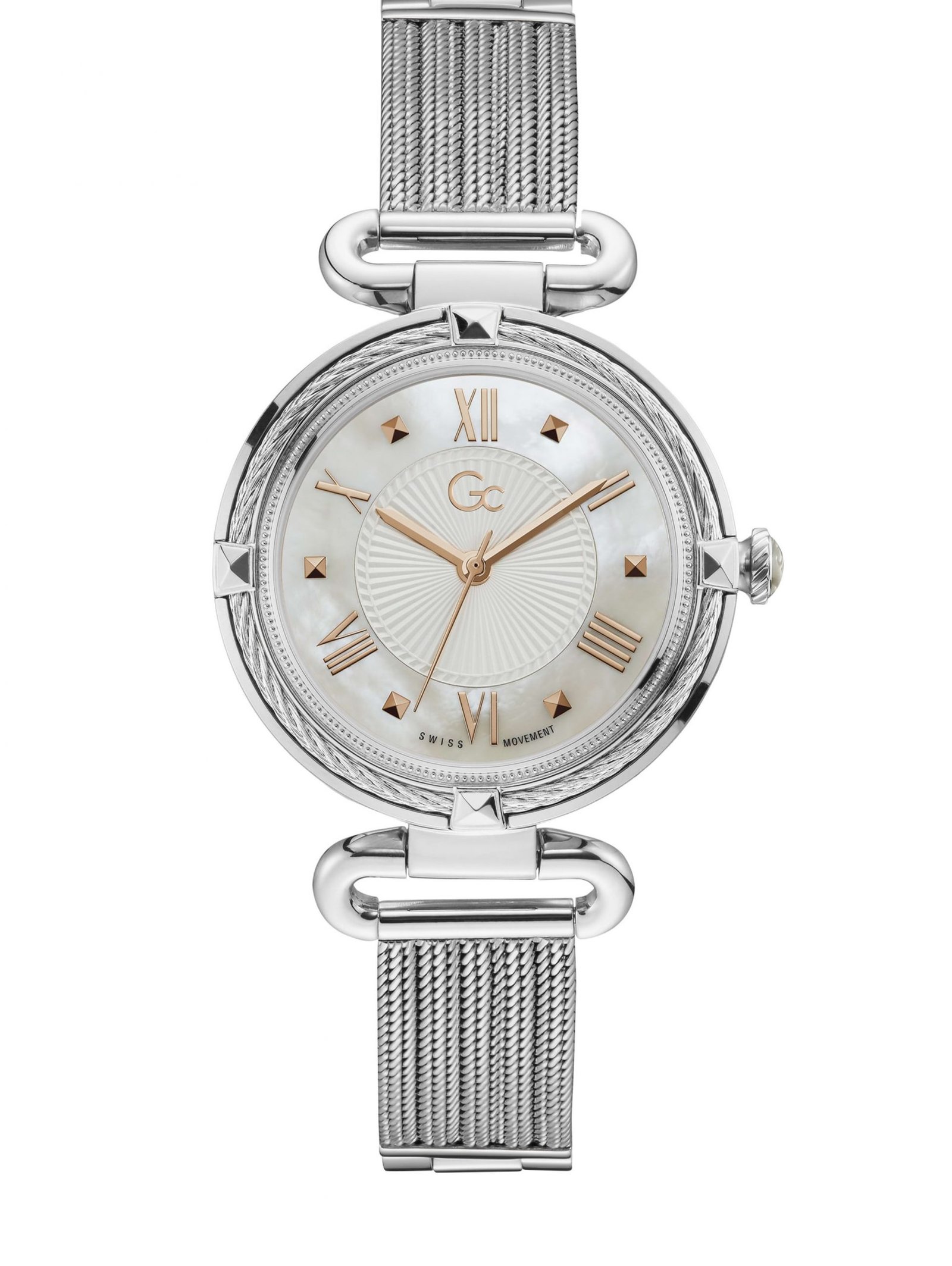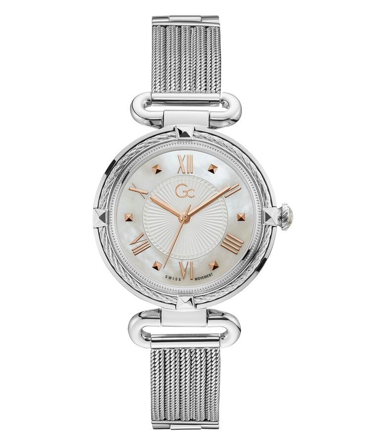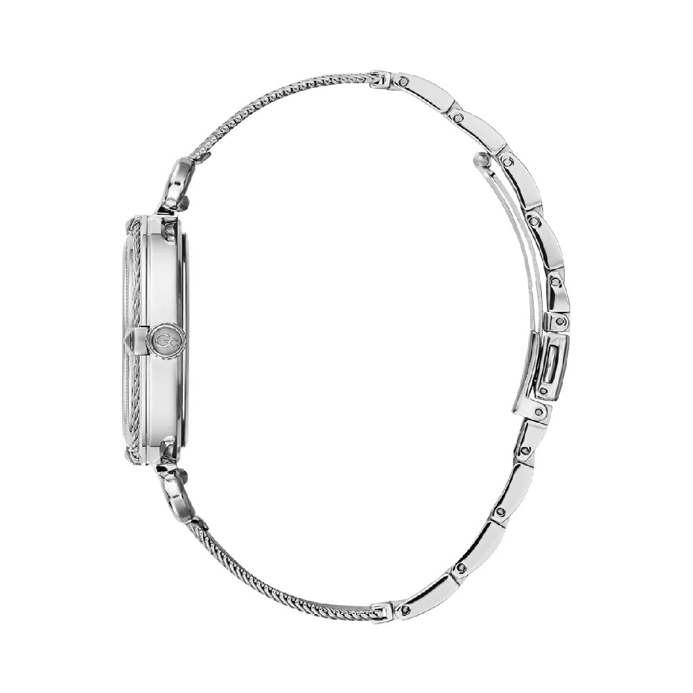 Refined silver tone cable detail frames the bezel and white guilloché mother of pearl dial on this dressy ladies style with its half ring bracelet attachment leading to a slim silver cable mesh bracelet