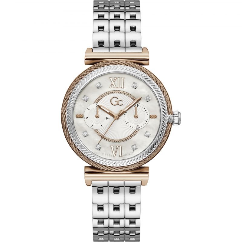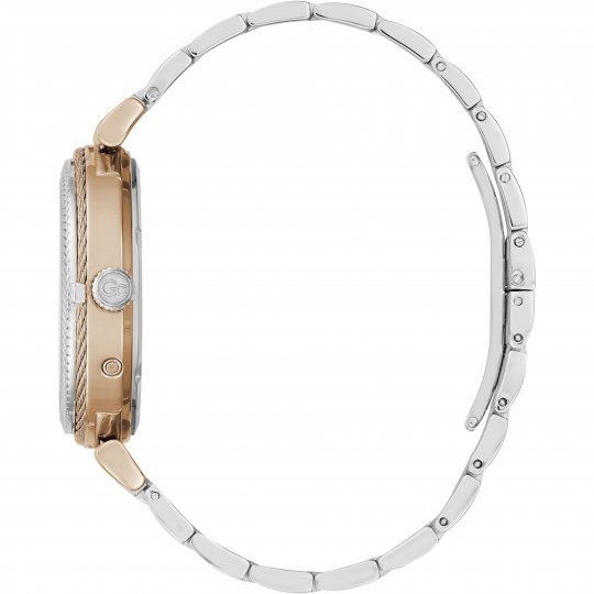 Enjoy a touch of sporty glamour in a two-tone day-date ladies timepiece with glittering rose gold cable and silver textured detail on its bezel, elegant white mother-of-pearl dial, Swarovski® crystal indices and triple-link polished silver-tone bracelet.