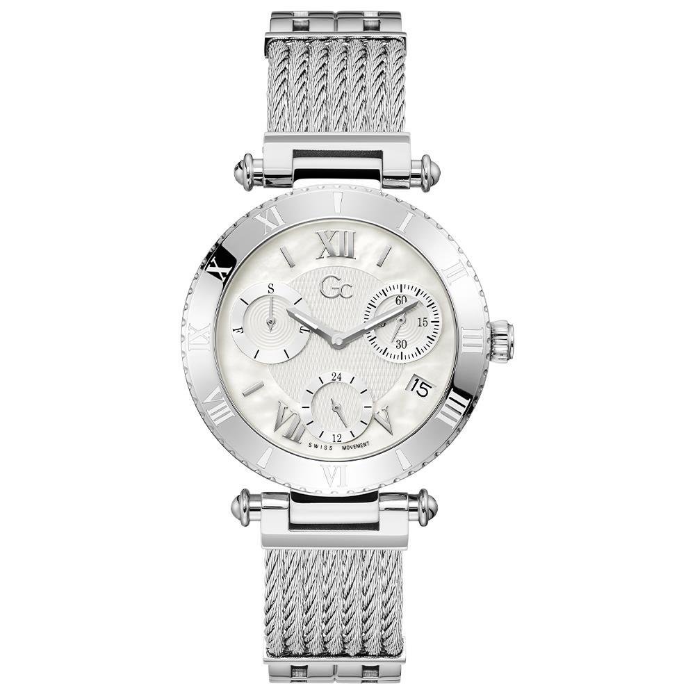 Add a touch of sophistication to the everyday with this all-silver tone multifunction watch, combining sporty chic through its crenulated bezel with the retro-touch of engraved Roman numerals, the elegance of its white mother-of-pearl dial and the stylistic twisted silver cable bangle bracelet.