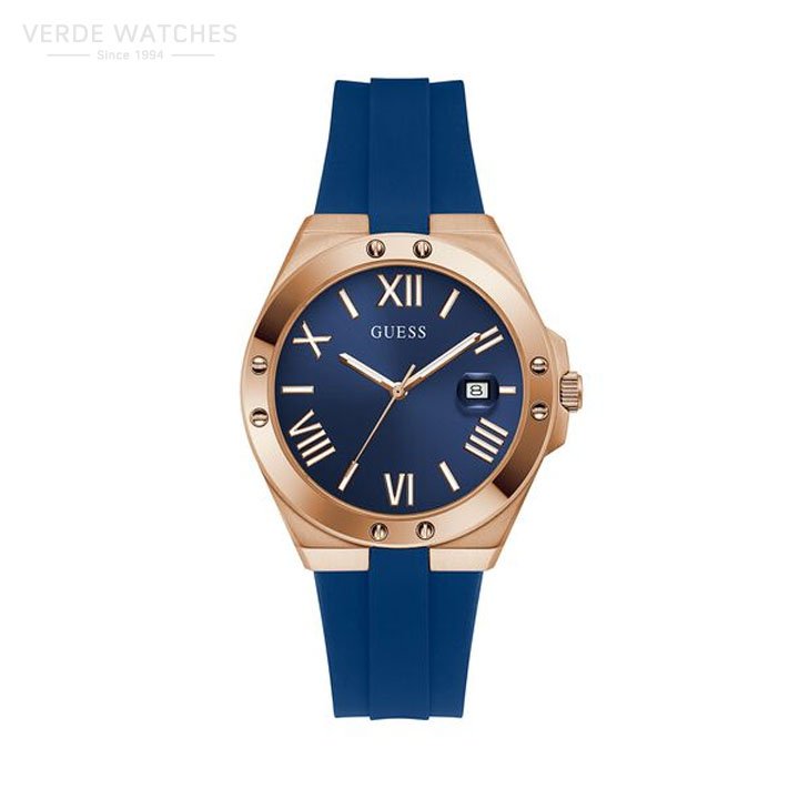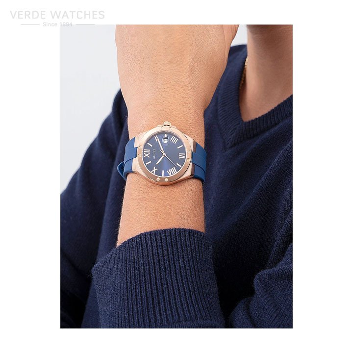 Water Resistant to 50 Meters Dial Finish: Sunray Case Material: Stainless Steel Band Color: Blue Buckle/Clasp: Strap Buckle Case Color: Rose Gold Tone Case Size: 41.0mm Dial Color: Blue Watch Movement: Date