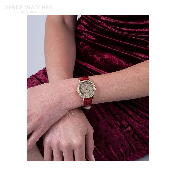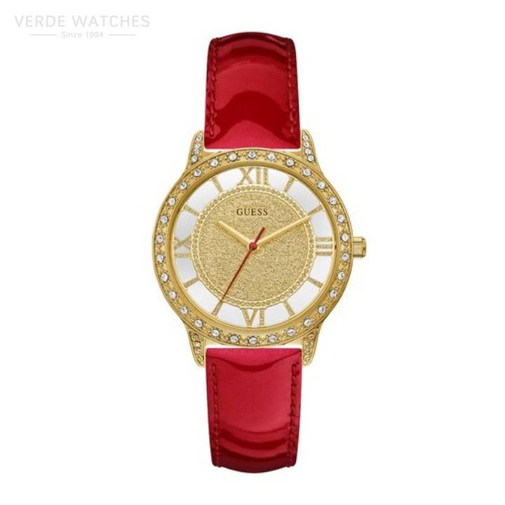Stainless Steel Case Water Resistant to 30 Meters Dial Finish: Glitz Case Material: Stainless Steel Band Color: Red Buckle/Clasp: Strap Buckle Case Color: Gold Tone Case Size: 34mm Dial Color: Champagne Watch Movement: Analog