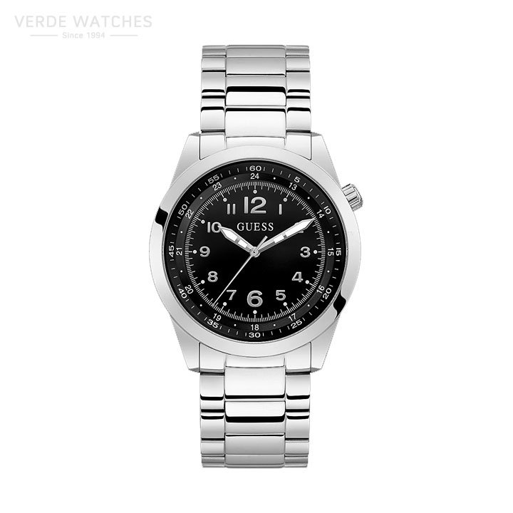 Water Resistant to 50 Meters Dial Finish: Sunray Case Material: Stainless Steel Band Color: Silver Tone Buckle/Clasp: Pilot Buckle Case Color: Silver Case Size: 42mm Dial Color: Black Watch Movement: Analog