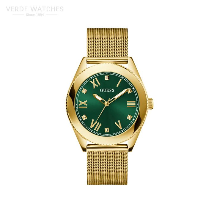 Genuine Diamond on Dial Water Resistant to 50 Meters Dial Finish: Sunray Case Material: Stainless Steel Band Color: Gold Tone Case Color: Gold Tone Case Size: 44mm Dial Color: Green Watch Movement: Analog