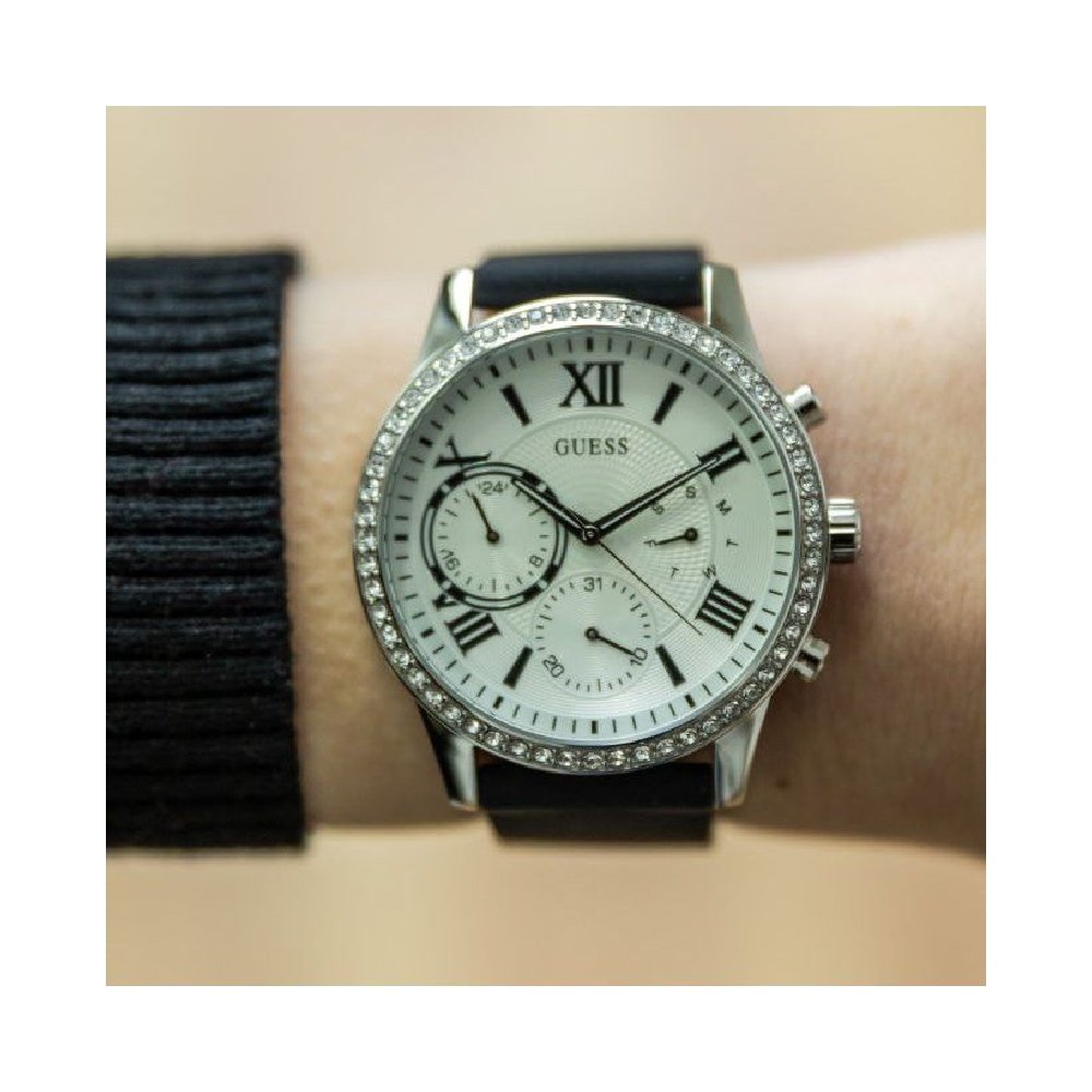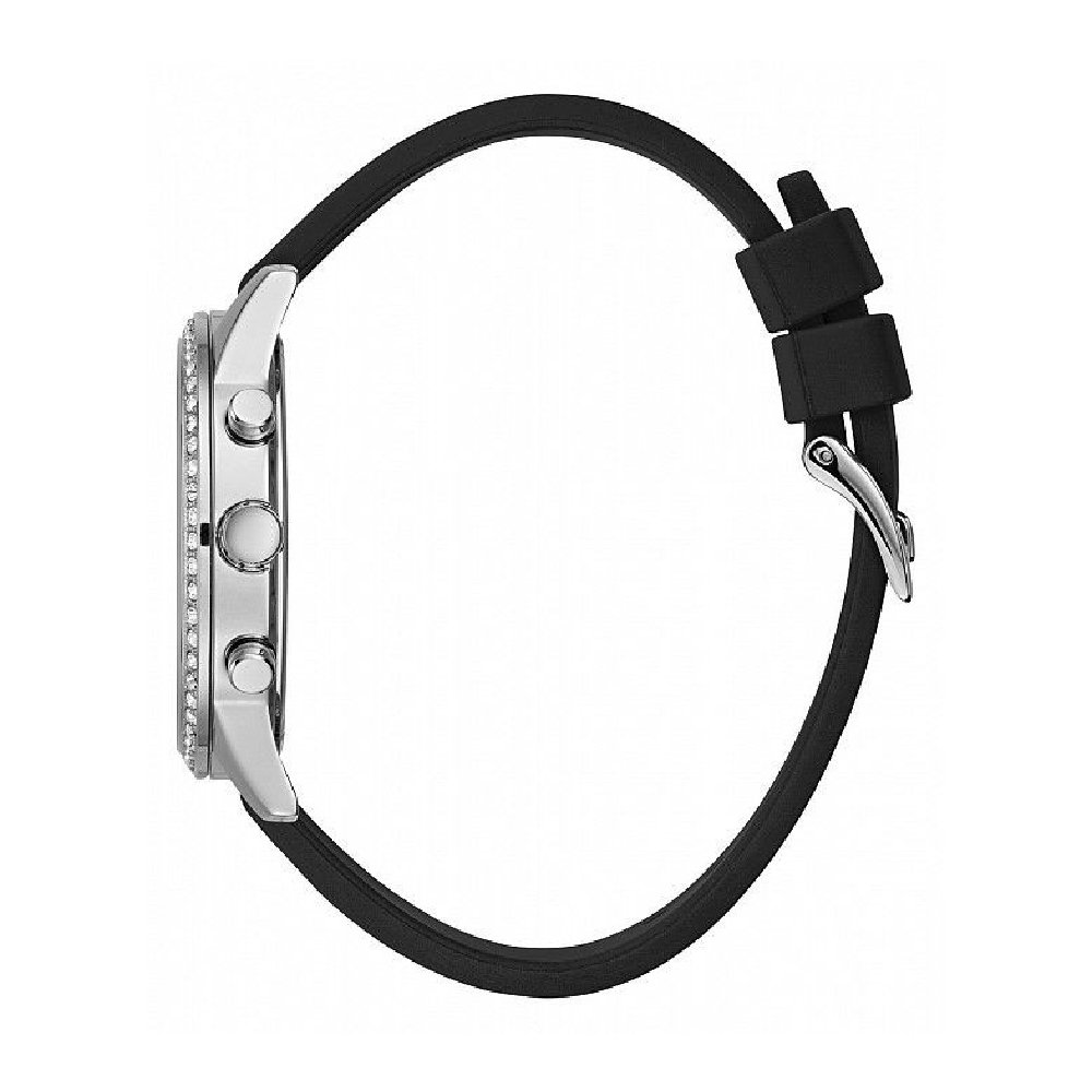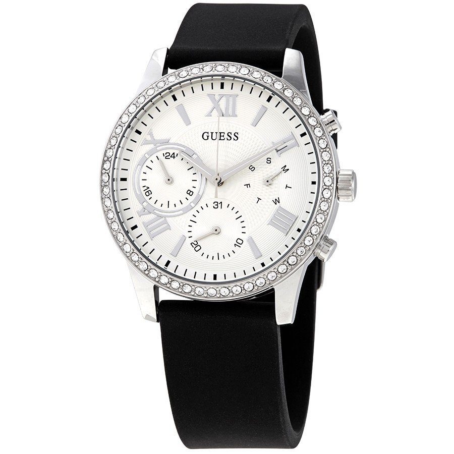 Stainless steel case with a black silicone strap. Fixed stainless steel bezel set with crystals. Silver dial with luminous silver-tone hands and alternating Roman numeral and index hour markers. Minute markers around the outer rim. Dial Type: Analog. Luminescent hands. Three multi-function sub-dials displaying: date, day of the week and 24 hour. Quartz movement. Scratch resistant mineral crystal. Pull / push crown. Solid case back. Round case shape. Case size: 40 mm. Case thickness: 10 mm. Band width: 20 mm. Tang clasp. Water resistant at 50 meters / 165 feet. Functions: date, day, hour, minute, second. Casual watch style. Watch label: Japan Movt