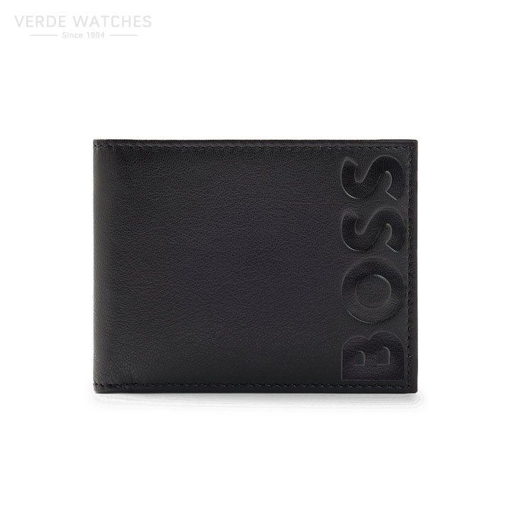 A signature wallet by BOSS. Featuring embossed branding inside and out, this compact wallet is crafted in grained leather with a soft feel and matte finish. For our RESPONSIBLE products, we always use at least 60% more sustainable raw materials. A minimum of 60% of the leather used to make this product has been sourced from certified tanneries using low-impact methods, for a reduced impact on the environment. By purchasing this product, you are supporting responsible leather manufacturing through the Leather Working Group (LWG). We only use skins and hides which are by-products of the food industry. Measurements: 8 x 11 x 1.5cm
