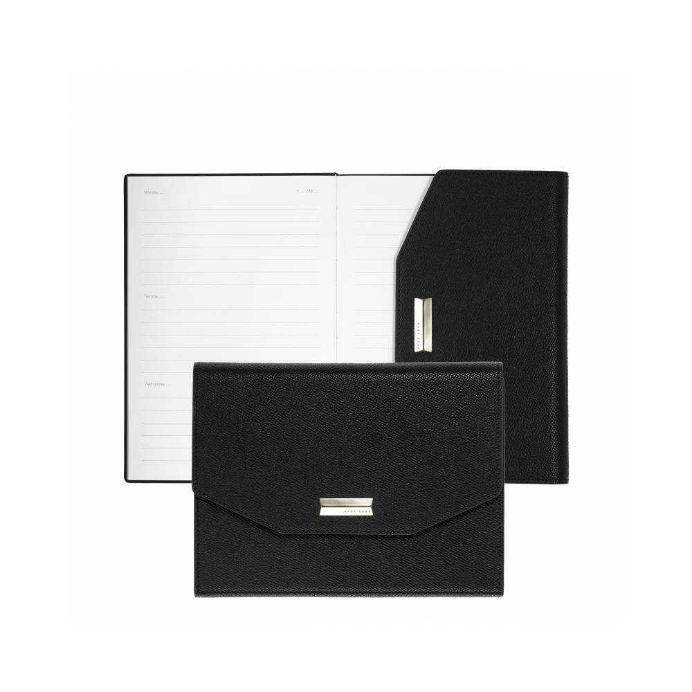 The agenda from the “Vivid” line is vibrant and feminine. The soft, textured material is enhanced by light gold-plated accents on the art-deco inspired metallic signature. The pages are undated and provide ample space for personal notes. The product is available in black. Ideal for an organized year with a chic and elegant look.