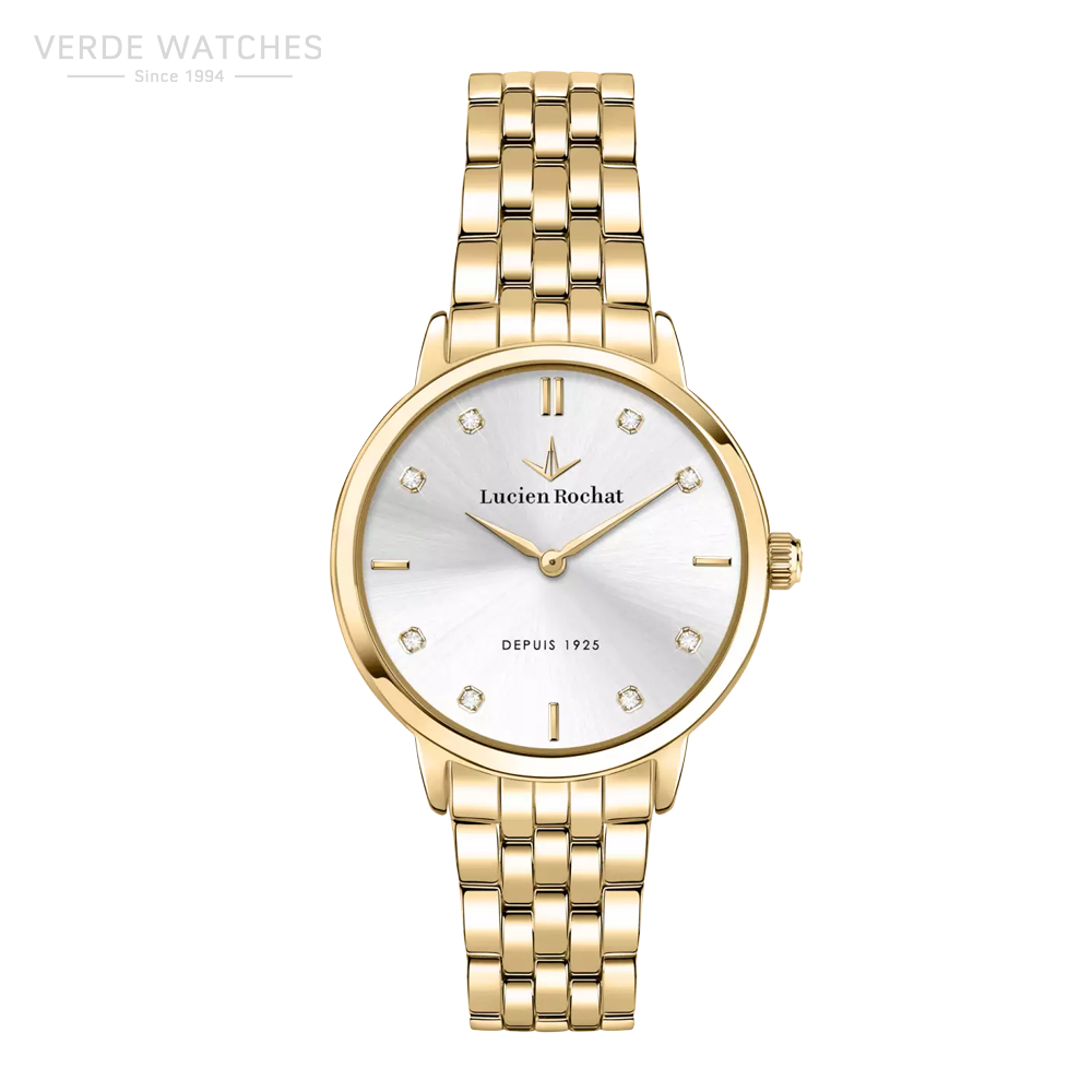 Lucien Rochat women’s watch. Only time clock with 2 hands made of steel, pvd gold, selected natural diamonds h /. The case is 30mm polished steel. The dial is of a bright white silver color. The sapphire glass. Yellow gold metal bracelet with buckle with buttons. The resistance to water is 3 atm. The reference is r0453115505