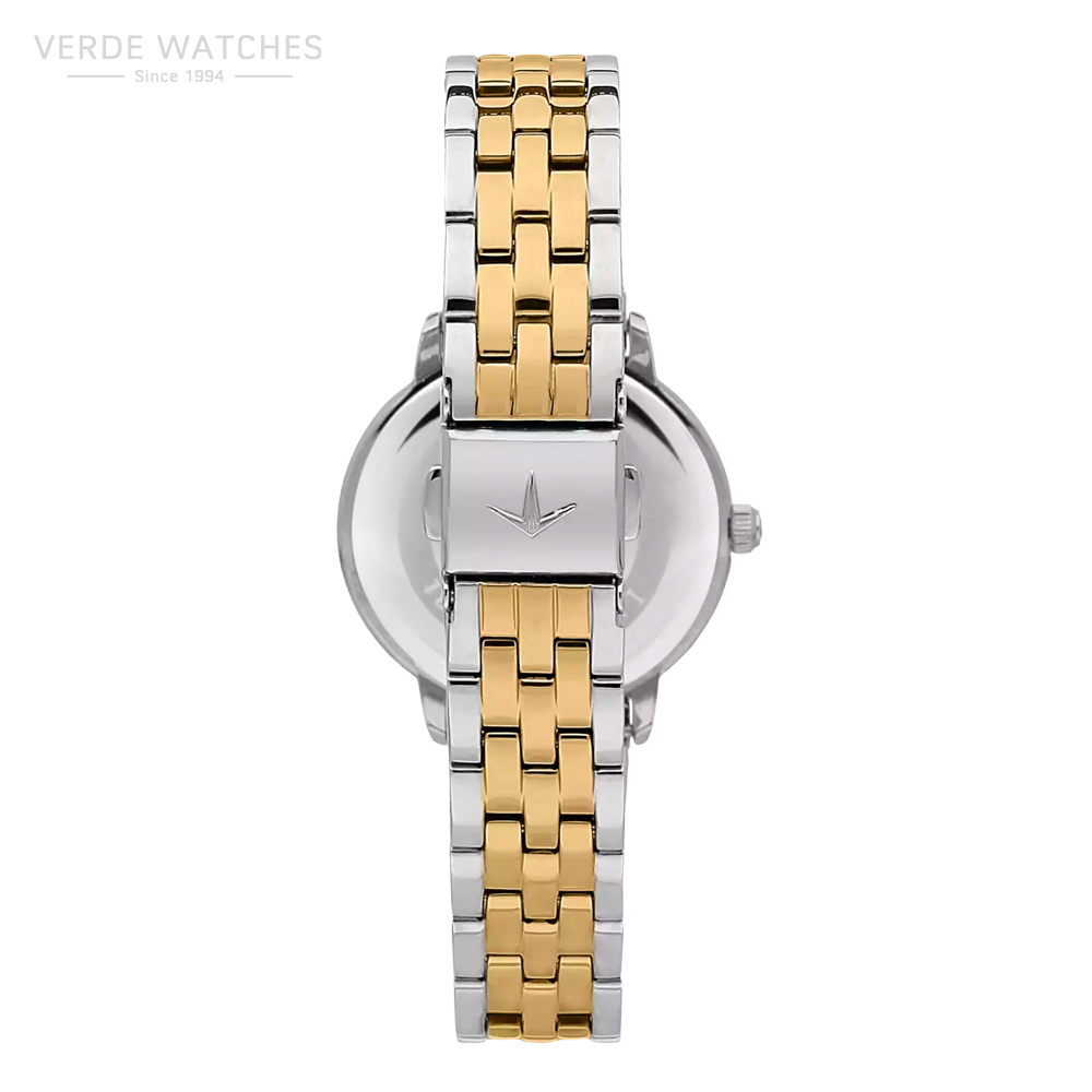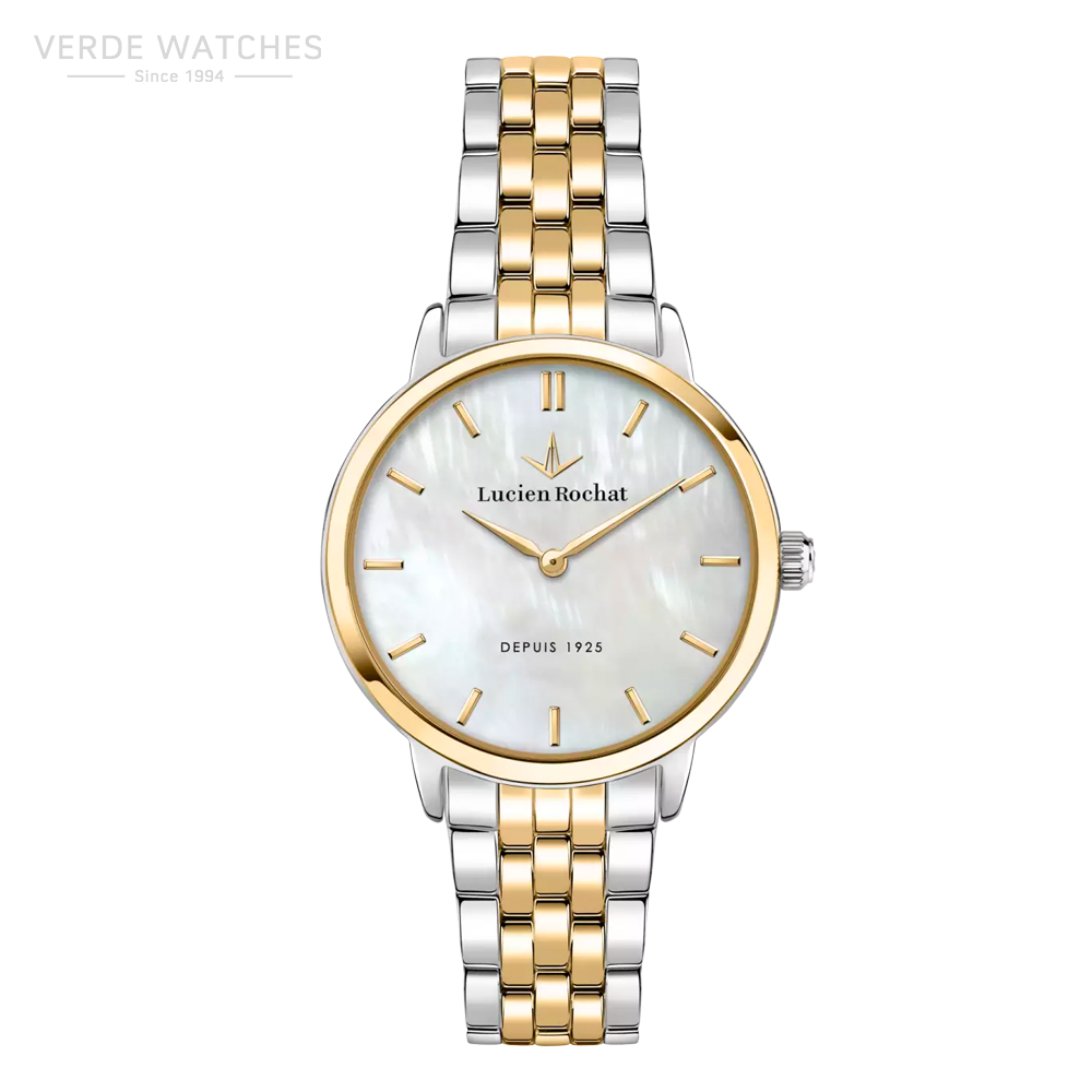 Lucien Rochat women’s watch. Only time clock with 2 hands made of steel, gold pvd. The case is 30mm polished steel. The dial is white mother of pearl. The sapphire glass treatment. Silver and gold color metal bracelet with buckle with buttons. The resistance to water is 3 atm. The reference is r0453115507