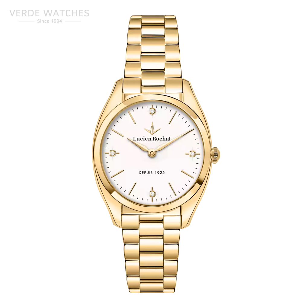 Lucien Rochat women’s only time clock from the mademoiselle collection. Watch in steel, pvd gold with white dial with natural diamonds selected h / ie case of 31mm. Watch with sapphire glass. Resistance to water 3 atm. The reference is r0453120502