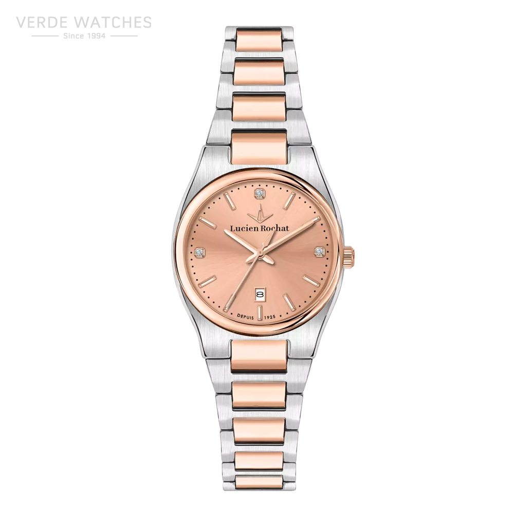 Women’s time and date watch from the Lucien Rochat brand from the Avenue collection. Jewel made of steel, rose gold PVD, natural diamonds in silver and rose gold color with a diameter of 31mm, water resistance is 3 ATM. The reference is R0453122509