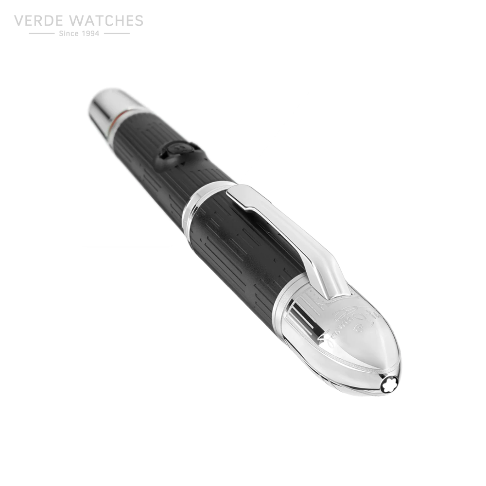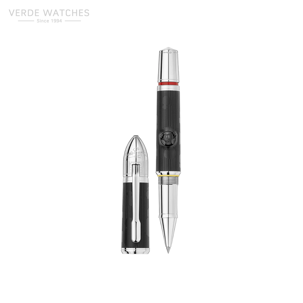 The name Walt Disney is forever bound with the art of film animation and American movie history. An empire of unimaginable proportions grew out of his initial idea to perfect the technique of making cartoons. Born in 1901 in Chicago, Walter Elias Disney became one of the most influential and most revered film producers of his time, thanks to his pioneering spirit and unique ability. The overall shape of the writing instrument is inspired by the legendary Monorail system, while colors are a reference to the original poster from “Steamboat Willy” (1920) which depicts Mickey Mouse. The cap and barrel in matte black precious resin feature several hidden Mickeys and the signature of Walt Disney can be found on the cap top. A major significance in Disney’s early career is celebrated with a set of coordinates engraved on the cone. They give the position of the garage belonging to Walt Disney’s uncle, where Walt Disney and his brother constructed a camera stand.