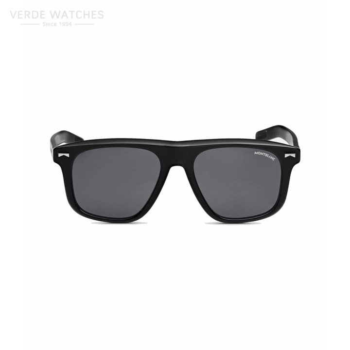 These sunglasses in a rectangular style have a black coloured acetate frame and grey lenses. Bold acetate profiles with 3 dimensional rivets on the front and the Montblanc lettering is laser engraved on the temple. The temple shape is sleek and flat for a contemporary look.