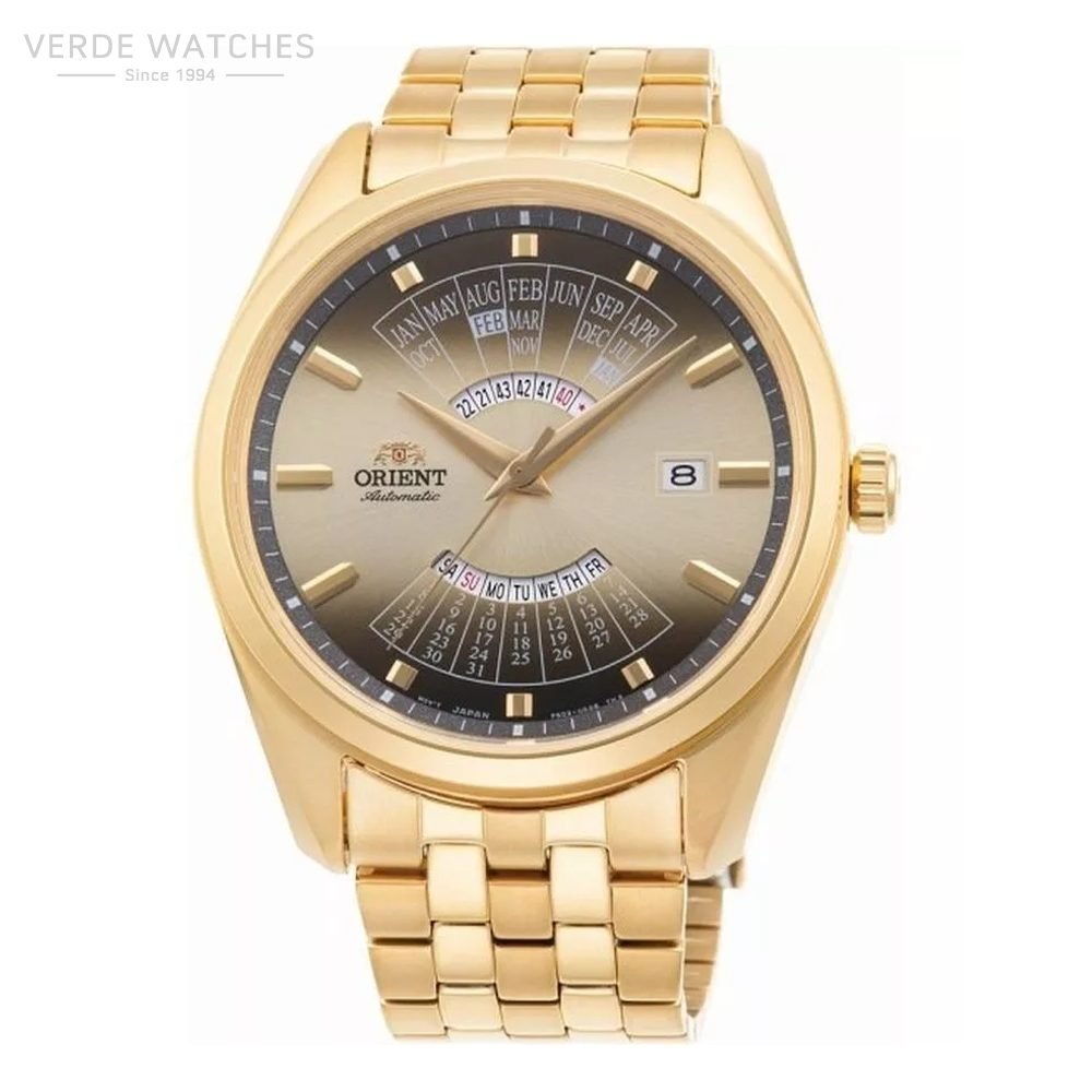 | Fusha | Champagne/Brown; orë, minutë, sekondë, datë, ditë, muaj + multi‑year calendar |