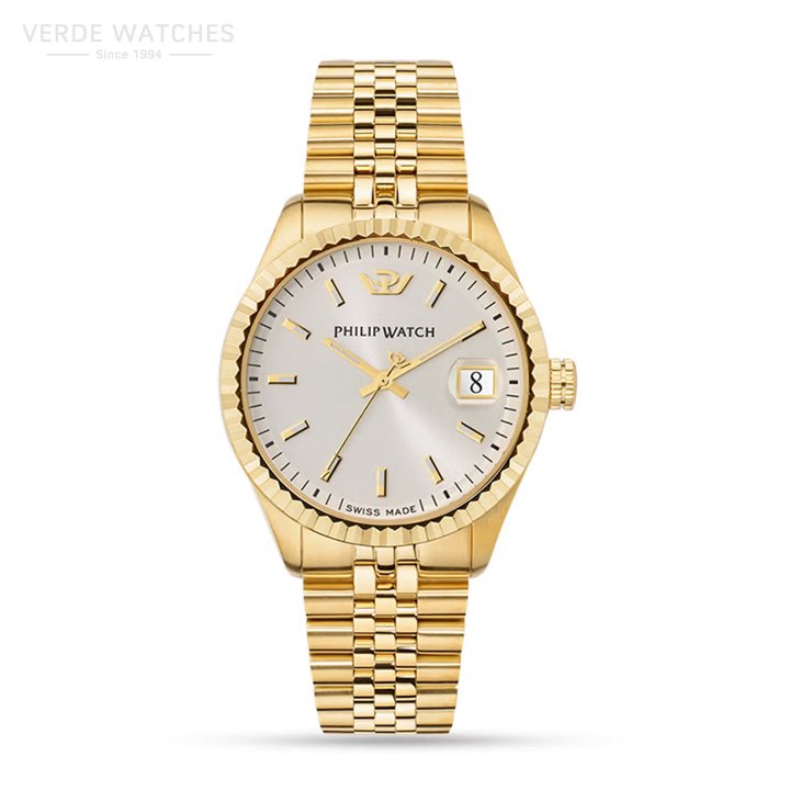 Philip Watch Watches Caribe – R8253597087 – Philip Watch experience: Urban, Gender: Male, Case Material & Finish: Air, Case size: 46×38.8mm, Case thickness: 9.35, Case finishing: Satinato, Case Colour: Silver, Crystal: Sapphire crystal, Strap Material: Bracciale in metallo, Strap Colour: Gold, Clasp type: Deployment buckle with side push safety, Movement: Quartz