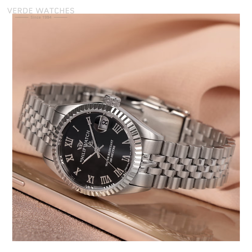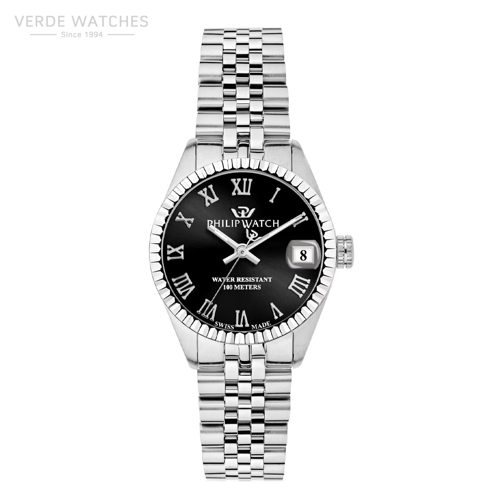 Philip Watch Watches Caribe – R8253597597 – Philip Watch experience: Urban, Gender: Female, Case Material & Finish: Stainless Steel, Case size: 39×31.3mm, Case thickness: 9.15, Case finishing: Satinato, Case Colour: Black, Crystal: Sapphire crystal, Strap Material: Bracciale in metallo, Strap Colour: Argento, Clasp type: Deployment buckle with side push safety, Movement: Quartz, Packaging: Philip Watch original packaging