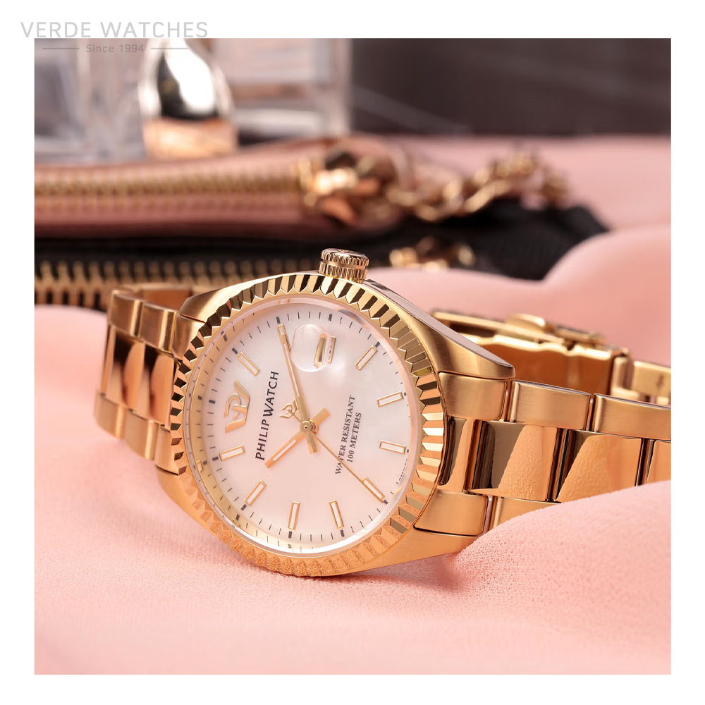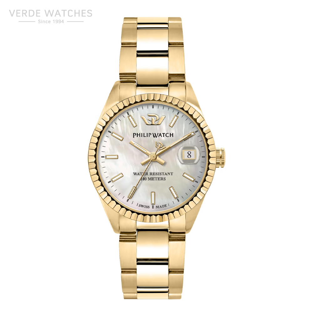 Philip Watch Watches Caribe – R8253597617 – Philip Watch experience: Urban, Gender: Female, Case Material & Finish: Stainless Steel, Case size: 35mm, Case thickness: 9,15, Case finishing: Satinato, Case Colour: Gold, Crystal: Anti-reflective sapphire crystal, Strap Material: Bracciale in metallo, Strap Colour: Gold, Clasp type: Double push fibbia, Movement: Quartz, Swiss made, Water resistant: 10 atm, Packaging: Philip Watch original packaging