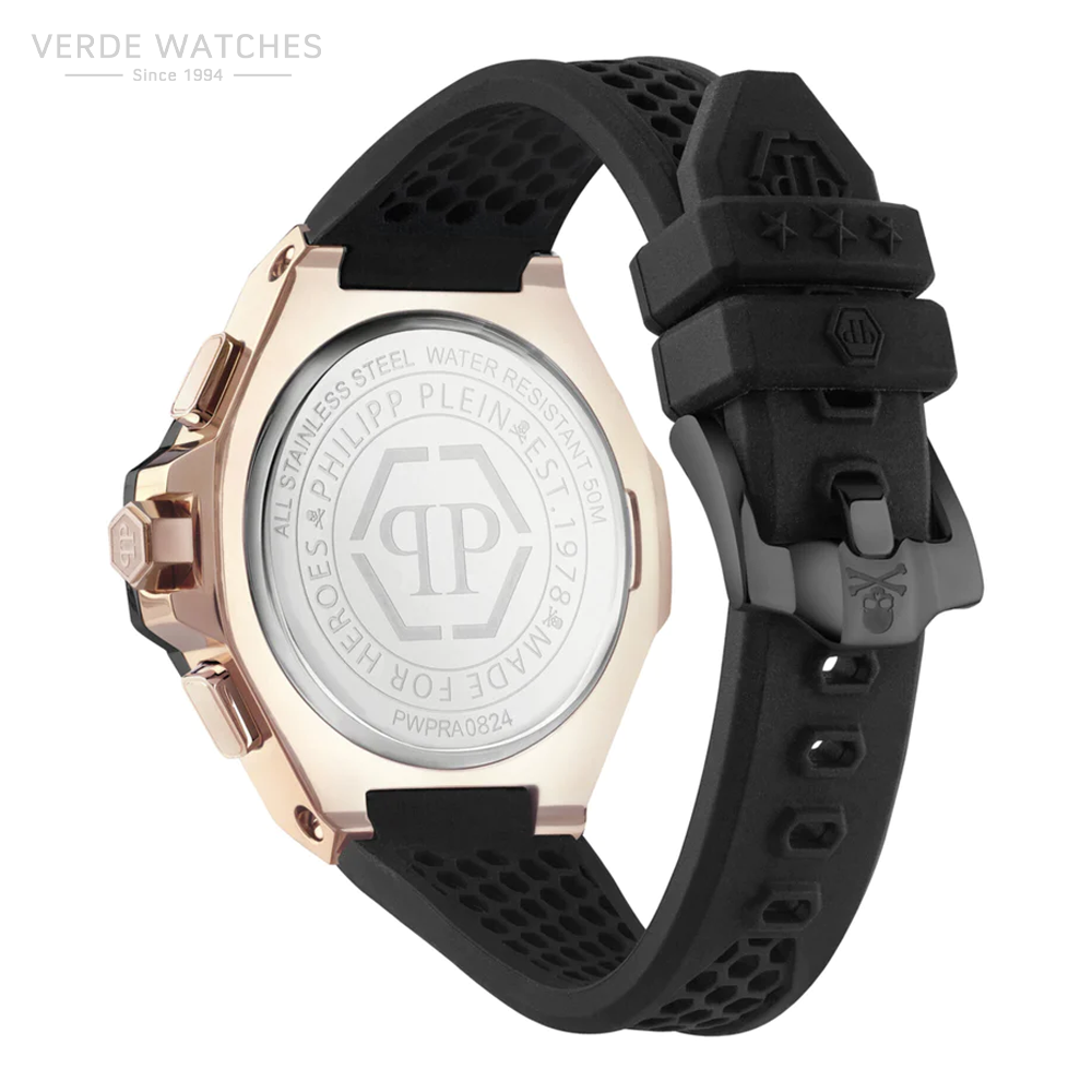 Disruptive, creative and technical. The 46mm geometric-shaped case of the Plein Chrono Royal and the wisely placed Maison’s symbols, make this timepiece the most robust of the season. The hexagon pattern on the dial and the hexagonal-shaped screws are recalling the greatness of the Philipp Plein iconicity. With this new illustrious line, Philipp Plein keeps setting fire to the watchmaking industry with its unmistakable style.