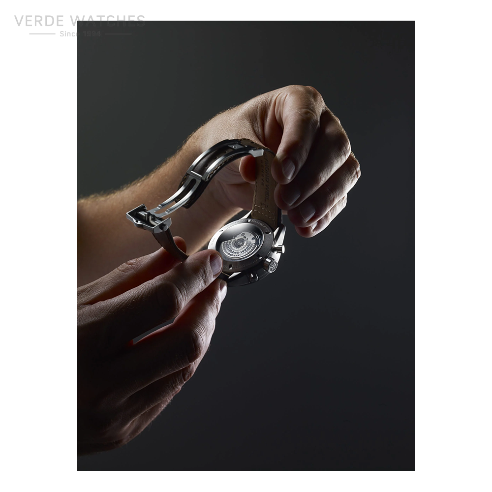 Housed in a round 42mm titanium-coloured stainless steel case, this new vintage-inspired freelancer chronograph offers a day date window at 3 o’clock, and a circular tachymeter scale. The deep blue satin-brushed dial contrasts the three beige chronograph counters and is completed by prominent nickel plated indexes matched perfectly by the slender hands. The Super-LumiNova® coated hands and indexes allow for full readability in the dark. The dial is protected by a sapphire crystal with anti-reflective coating providing maximum durability and visibility. This men’s automatic self-winding freelancer boasts the Calibre RW5200 chronograph movement. It has a 48-hour power reserve and beats at a frequency of 28,800 vibrations per hour.