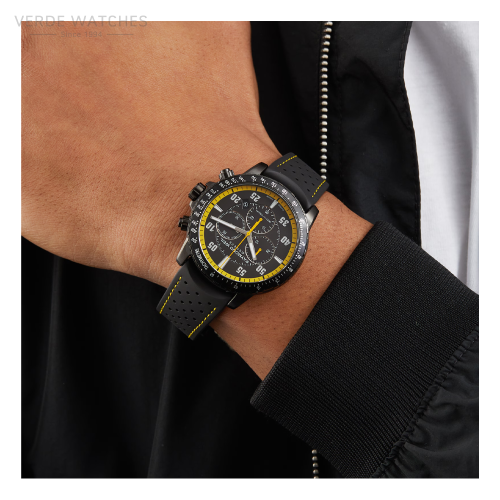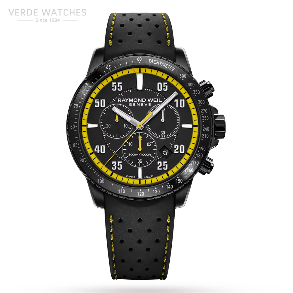 Elegant and stylish this gents watch from the Raymond Weil Tango collection, is black PVD coated steel. The 42mm sized case features a black steel bezel with yellow tachymetre markings. The black dial has 3 chronograph zones, with a date window at 3 o’clock and bright Superluminova numeral indicators and hands. This Tango is presented on a black perforated strap with yellow stitching. The Raymond Weil watch collection has a 2 year manufacturers warranty