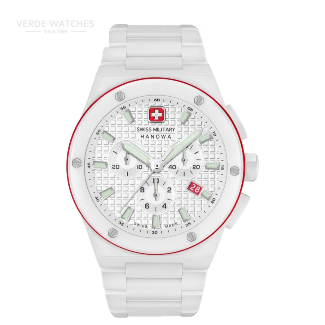 Designed for the wildest adventures, Sidewinder Ceramic is the perfect fusion of style and durability. The all-white design with striking red highlights exudes contemporary elegance. Equipped with chronograph function, it ensures accurate timekeeping at all times. To ensure enhanced visibility, it features luminous hands and indices, while the ceramic body boasts exceptional durability.