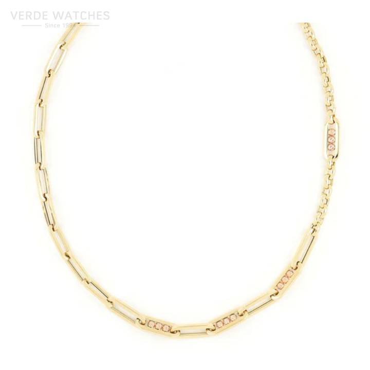 Stylish and with a rock attitude, this necklace is celebration of contemporary style and elegance. The classical appeal of yellow gold is balanced by the unusual allure of re gold details, while the soft round shape of the beads creates a nice contrast with the sleek, elongated design of the links and with the triangle charm.
