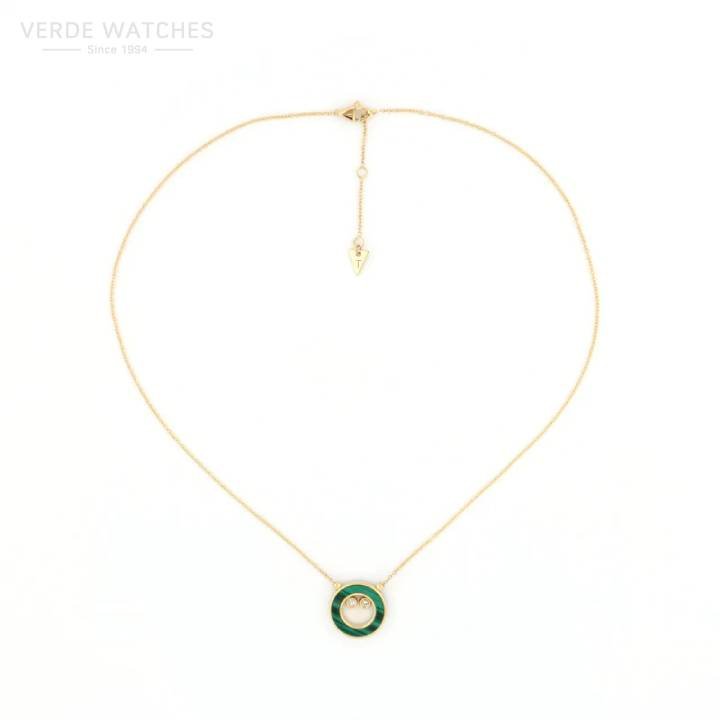 18 kt yellow gold necklace with circle pendant with malachite and diamonds: round central charm in natural malachite stone framed in polished gold with 1.6 cm diameter, with two diamonds (0.05 ct). Total length 45 cm with reductions at 41 cm and 43 cm, polished chain and modern clasp closure, triangle charm with Tavanti logo.