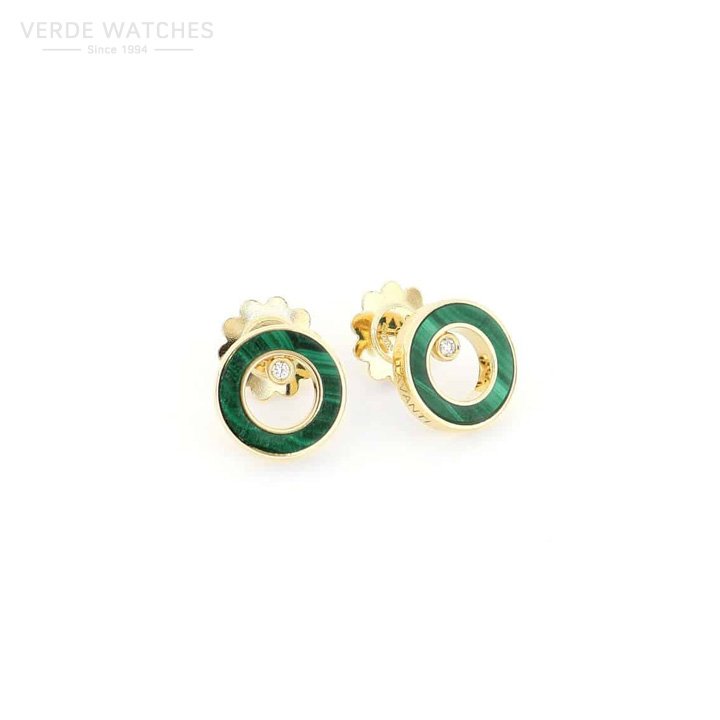 This yellow gold earrings set enhanced with malachite and plays on chromatic and light contrasts and, thanks to the presence of diamonds. Versatile and refined with a contemporary and timeless design.