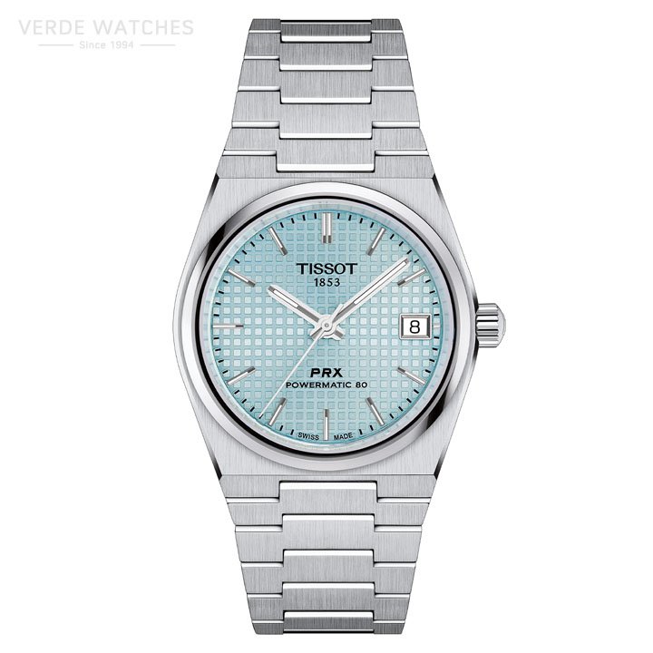 Tissot PRX 35mm Powermatic 80, where timeless aesthetics meet contemporary technology. This 35mm watch exhibits a high-quality steel case and a vibrant ice blue dial. This trendy shade casts an exquisite hue, perfectly catching and reflecting light. The distinctive waffle dial pattern adds a unique sophistication to this automatic model. Equipped with water resistance up to 100 meters and a Nivachron™ balance hairspring, the PRX ice blue becomes an alluring choice for the style-conscious and practical watch enthusiast. The satin-finish steel bracelet, complete with a triple-blade folding steel clasp, ensures an impeccable fit. Showcase your taste with the Tissot PRX 35mm Powermatic 80 in ice blue.
