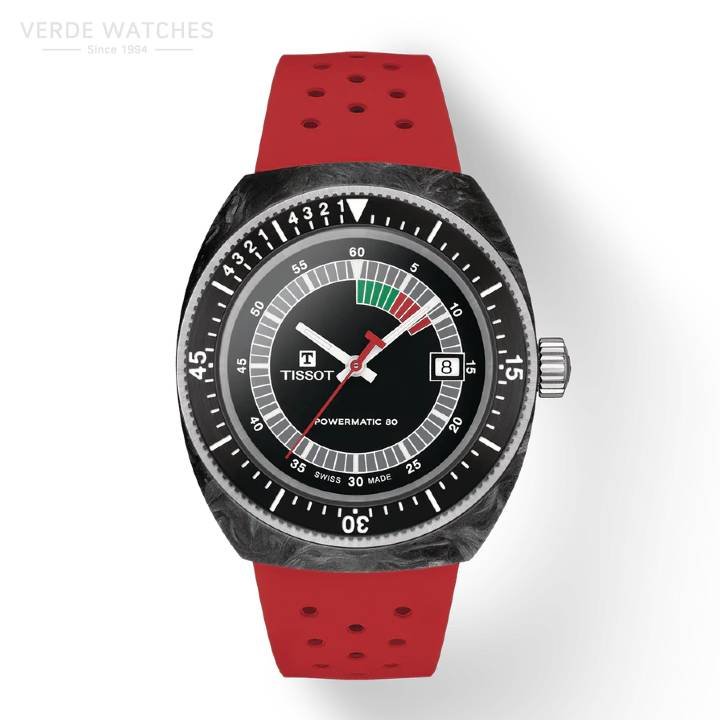 Discover the Tissot Sideral, a captivating fusion of vintage allure and modern craftsmanship. The watch features a 41mm wide forged carbon case and a bold red strap. The dial presents a multi-coloured luminescent animation, amplifying its distinct appeal. Water-resistant up to 30 bar (300 meters) and equipped with Super-LumiNova® coated indices, the Sideral is a statement piece for trendsetters and history enthusiasts. Effortlessly modify your look with the interchangeable perforated rubber strap. Make a statement with the Tissot Sideral.