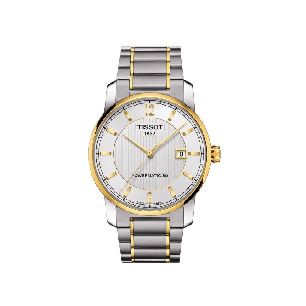 Titanium case with a titanium bracelet with Gold PVD links. Fixed gold PVD titanium bezel. Silver dial with gold-tone hands and index hour markers. Arabic numerals mark the 6 and 12 o’clock positions. minute markers around the outer rim. Dial Type: Analog. Date display at the 3 o’clock position. Tissot calibre Powermatic 80 (C07.111) automatic movement with an 80-hour power reserve. Scratch resistant sapphire crystal. Pull / push crown. Transparent case back. Round case shape. Case size: 40 mm. Case thickness: 9 mm. Band width: 22 mm. Band length: 7 inches. Deployment clasp. Water resistant at 30 meters / 100 feet. Functions: date, hour, minute, second. Casual watch style. Watch label: Swiss Made. Tissot T-Classic Automatic Silver Dial Two-tone Mens Watch T0874075503700.