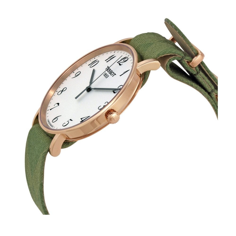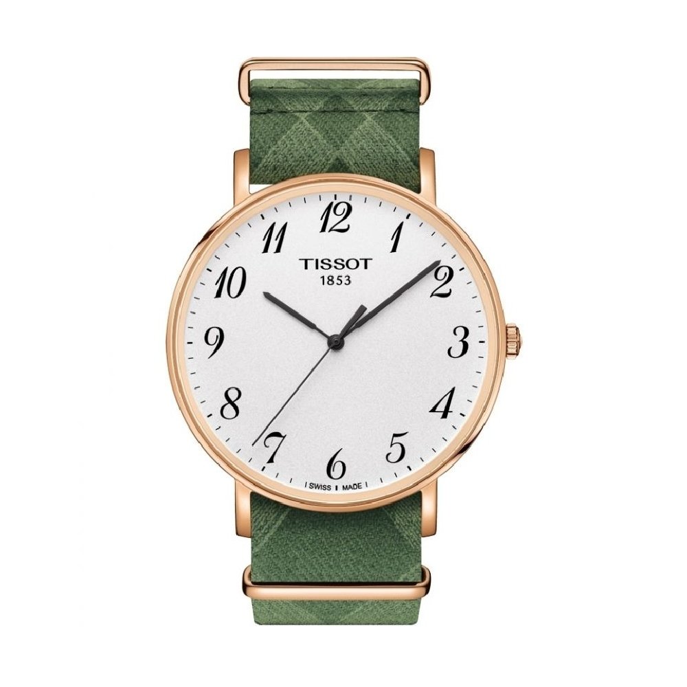 Rose gold PVD stainless steel case with a green nylon NATO strap. Fixed rose gold PVD bezel. White dial with black hands and Arabic numeral hour markers. Minute markers around the outer rim. Dial Type: Analog. Tissot calibre 902.101 quartz movement. Scratch resistant sapphire crystal. Push / poull crown. Solid case back. Case size: 42 mm. Case thickness: 6.45 mm. Round case shape. Band width: 20 mm. Tang clasp. Water resistant at 30 meters / 100 feet. Functions: hour, minute, second. Additional Info: In general, withstands splashes or brief immersion in water, but not suitable for swimming. Casual watch style. Tissot Everytime Big Gent White Dial Mens Watch T1096103803200.