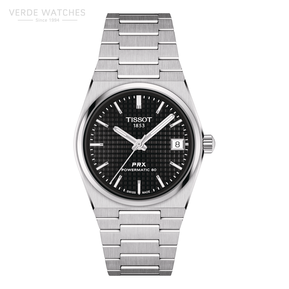 Discover the Tissot PRX 35mm Powermatic 80, a captivating blend of timeless elegance and modern innovation. This 35mm watch features a high-quality steel case and a sleek black dial, reimagining its iconic 1978 roots. The distinctive waffle dial pattern adds a touch of sophistication and sets the automatic model apart. Water-resistant up to 100 meters and equipped with a Nivachron™ balance hairspring, the PRX is a versatile piece for discerning watch enthusiasts. The satin-finish steel bracelet with a triple-blade folding steel clasp ensures a comfortable fit. Embrace the allure of the Tissot PRX 35mm Powermatic 80 in black.